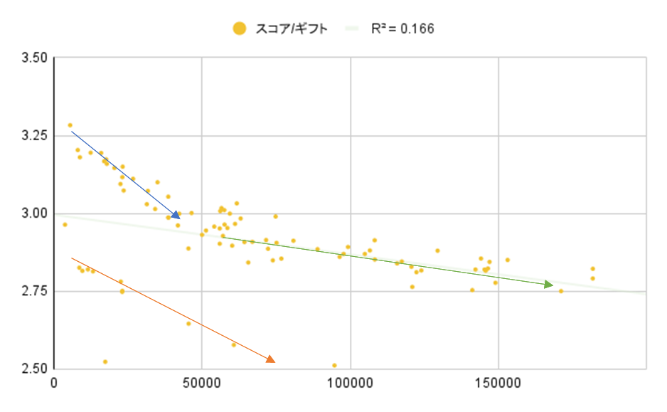 どちらの場合でもおおよそ傾きが 2.7 弱になっています. なお,切片が正の値をもっているので,ライブスコアがコイン数の 2.7 倍になるという意味ではない点に注意してください. 50k コイン以上では,例えば 1k コイン投げると,3k ライブスコアが増加するはずだったのに,2.7k ライブスコアしか増加しない,という意味です.