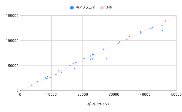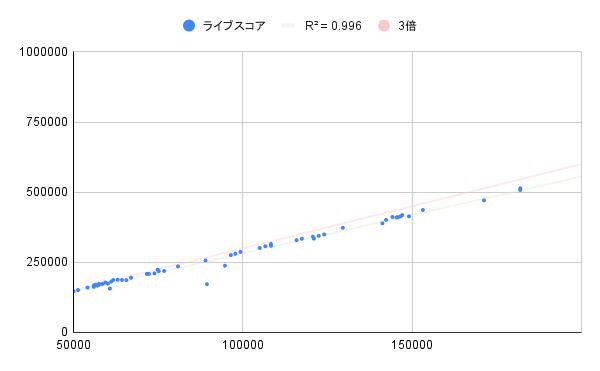 - 50k コイン(150k ライブスコア)を超えると,3倍を規則性をもって下回る傾向が見られました.