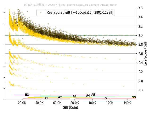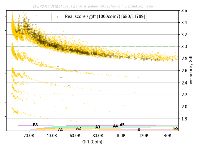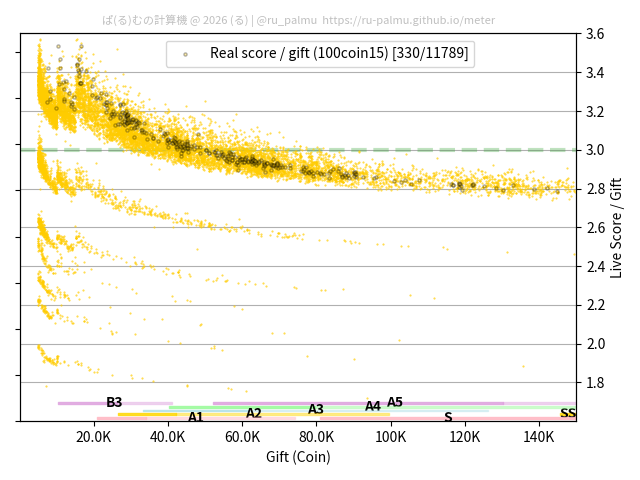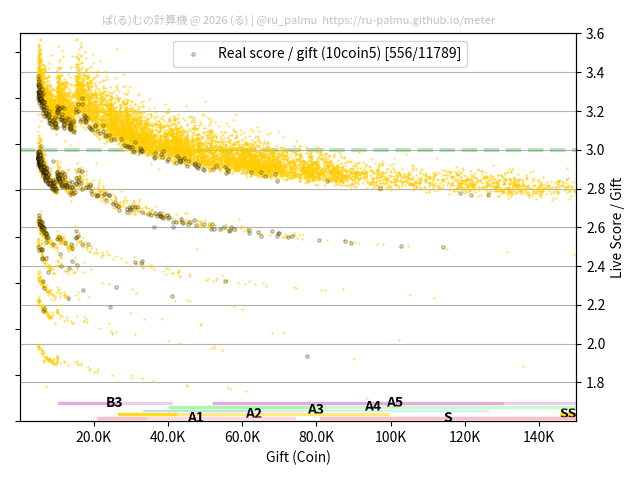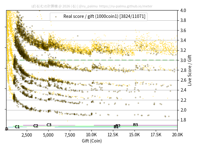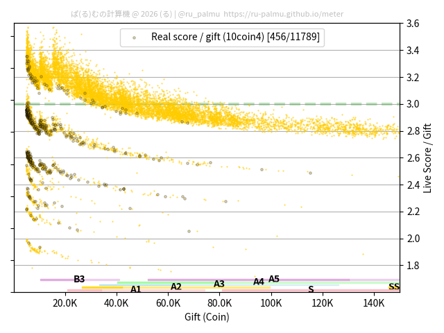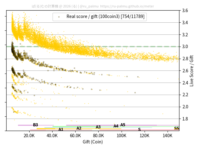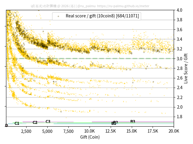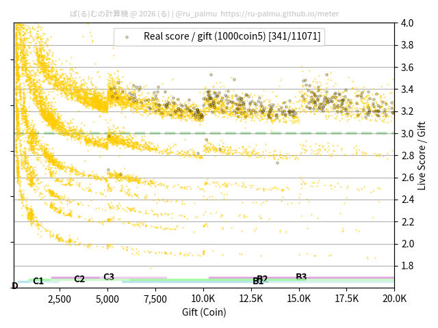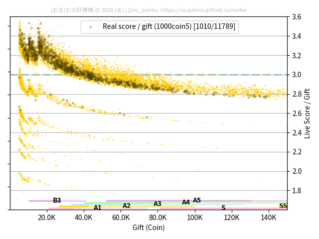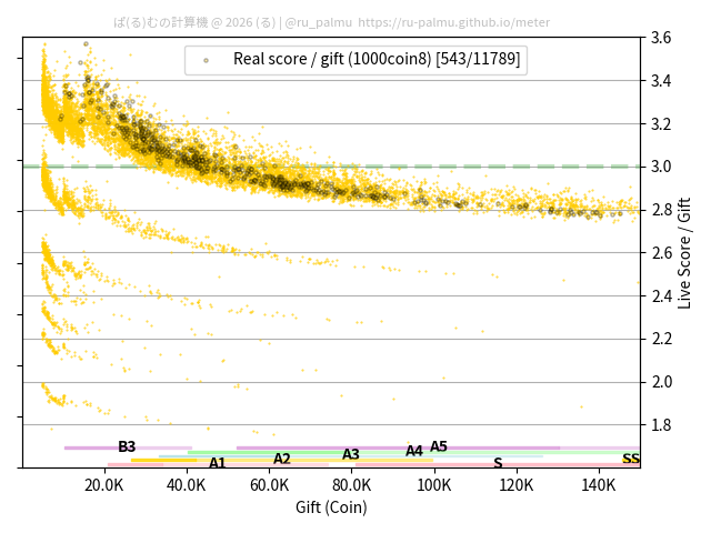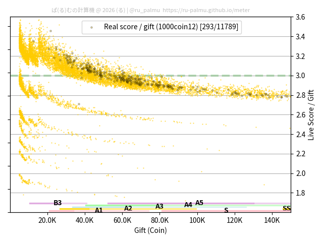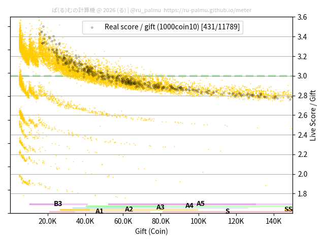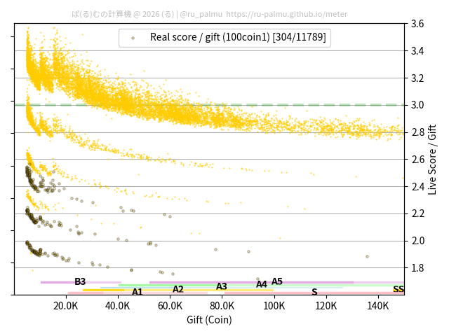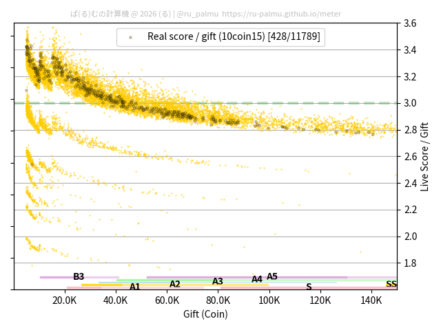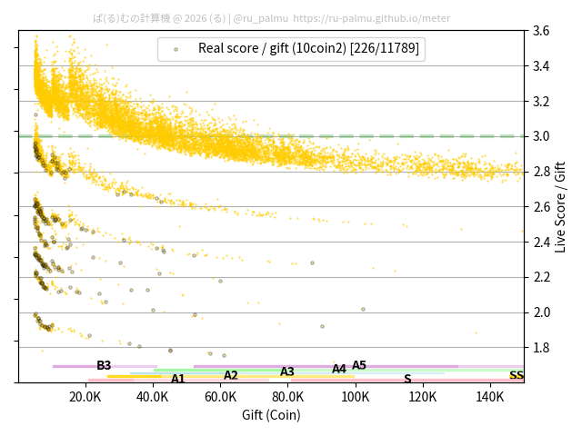 上の散布図は,横軸がコイン数(ギフト数),縦軸がはね率(=ライブスコア÷コイン数)の実測値を表しています. 縦軸の値は 3 になると信じられていたものです.