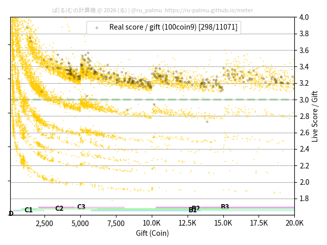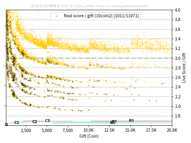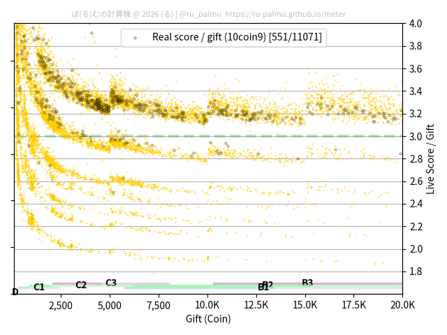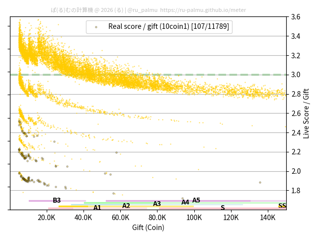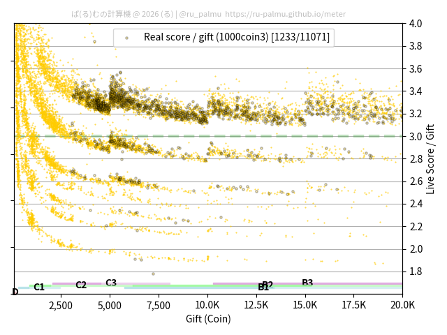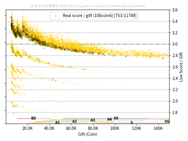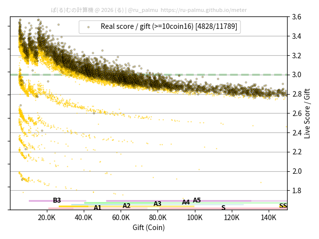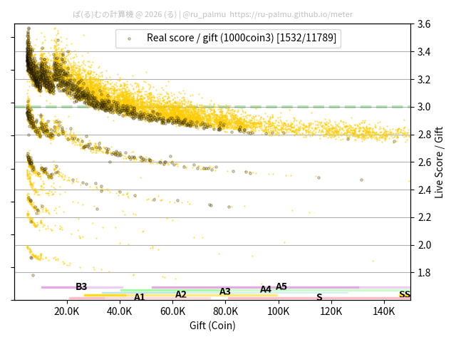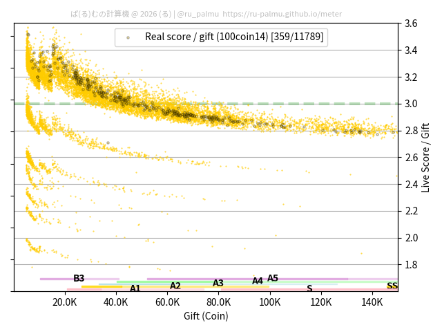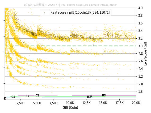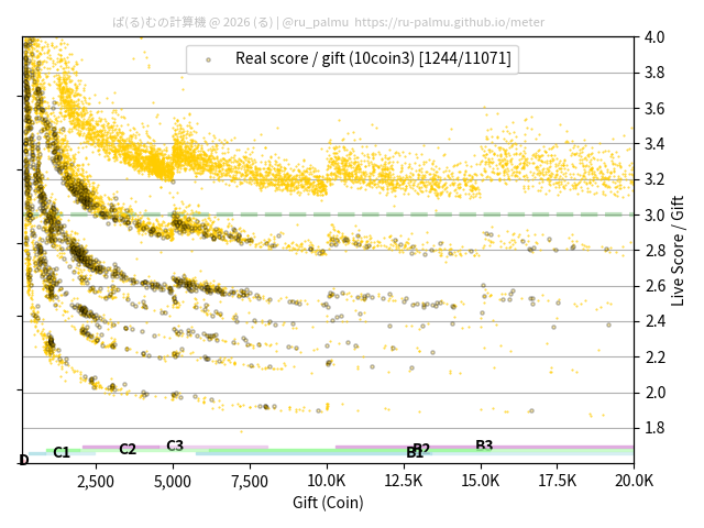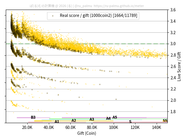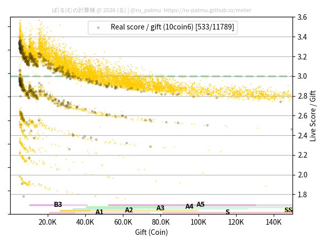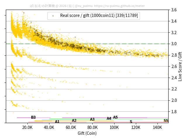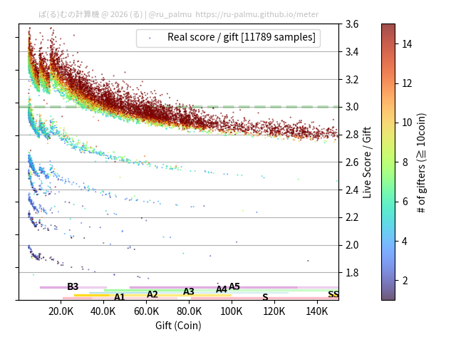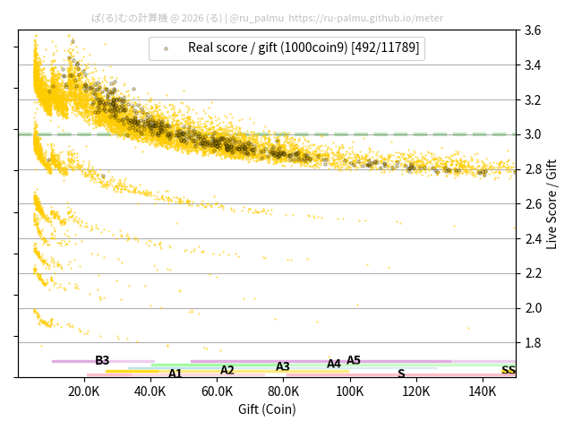 上の散布図は,横軸がコイン数(ギフト数),縦軸がはね率(=ライブスコア÷コイン数)の実測値を表しています. 縦軸の値は 3 になると信じられていたものです.