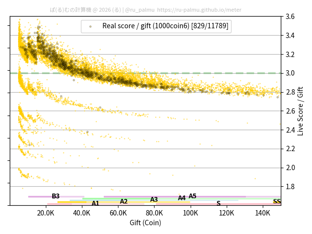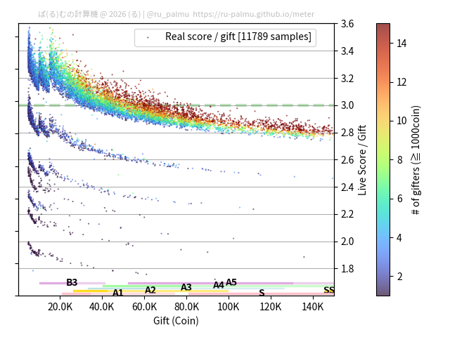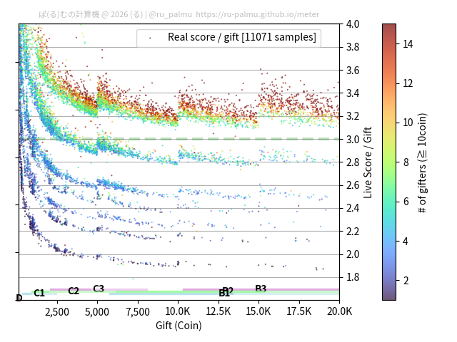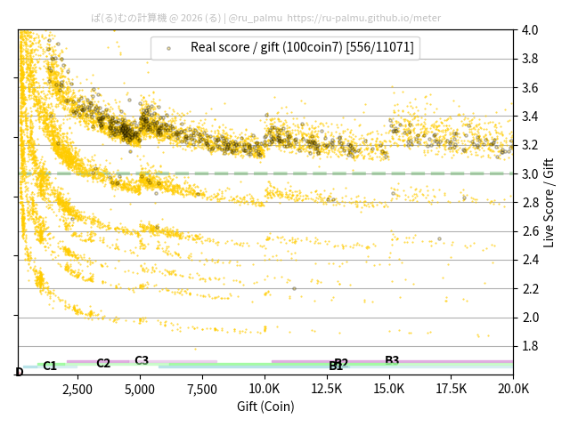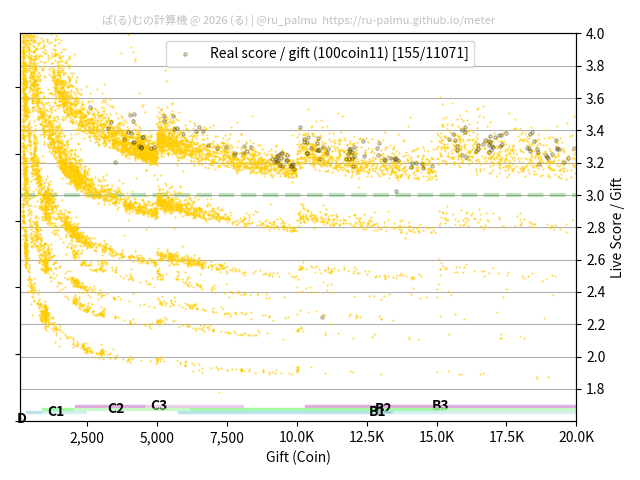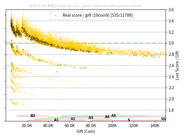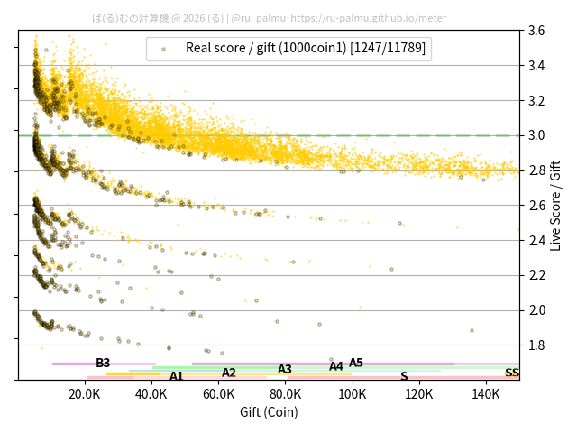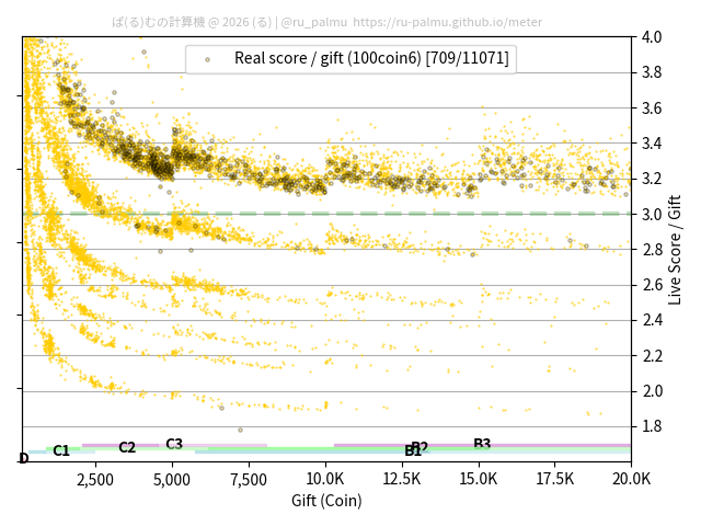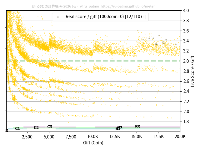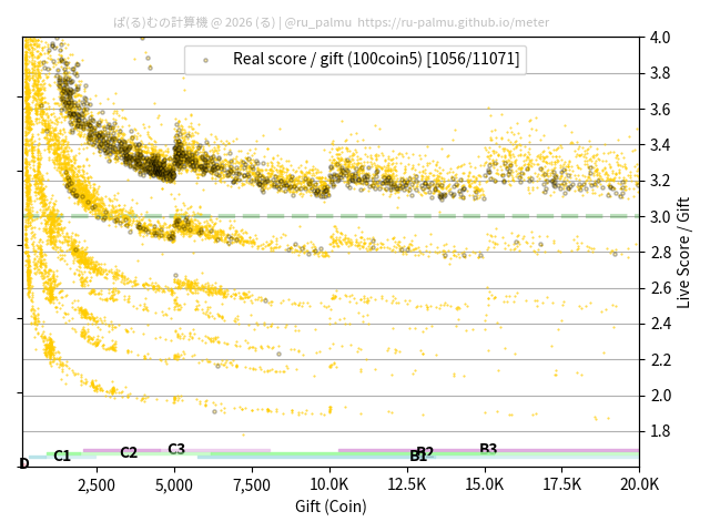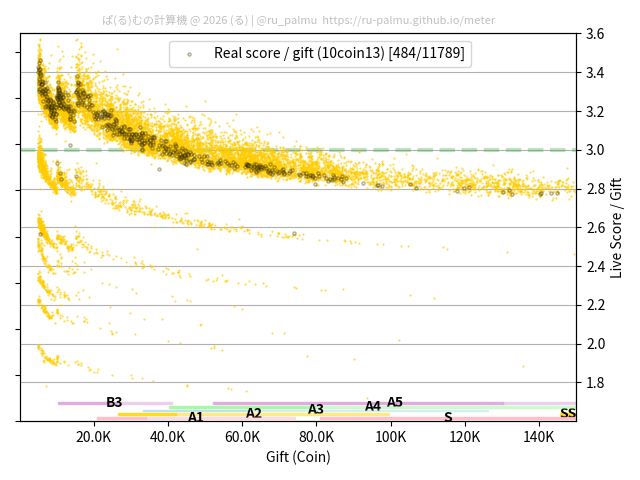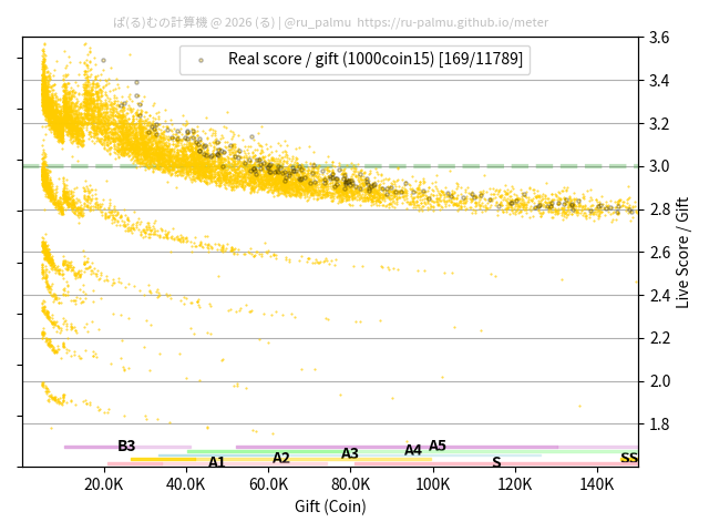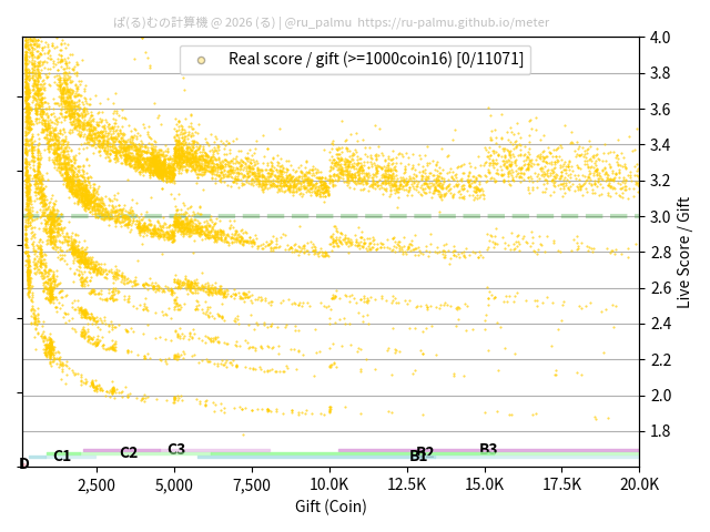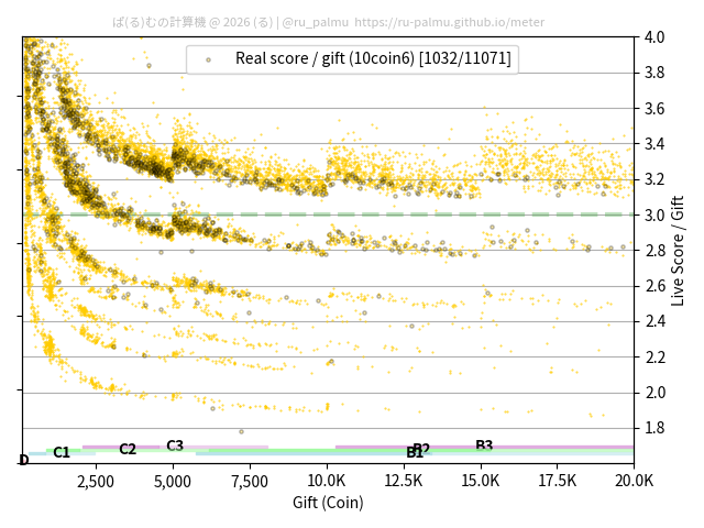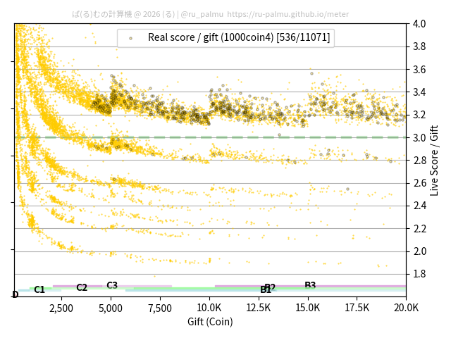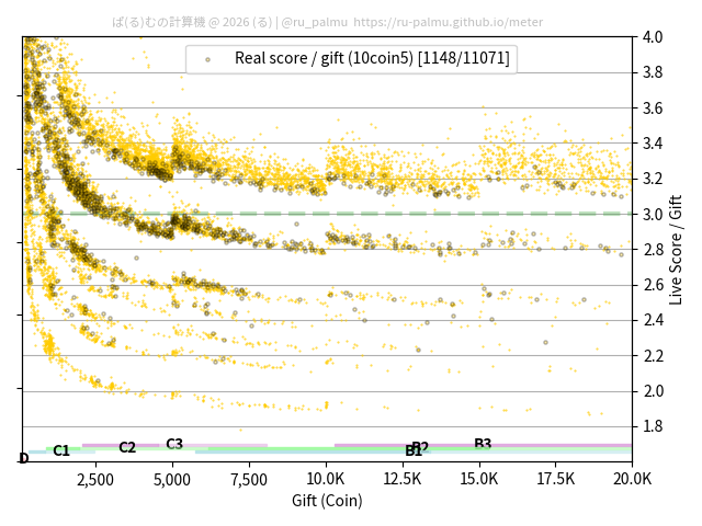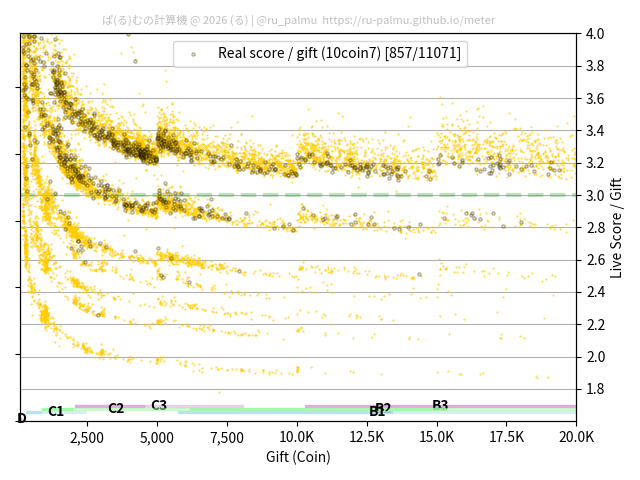 上の散布図は,横軸がコイン数(ギフト数),縦軸がはね率(=ライブスコア÷コイン数)の実測値を表しています. 縦軸の値は 3 になると信じられていたものです.