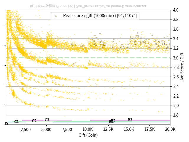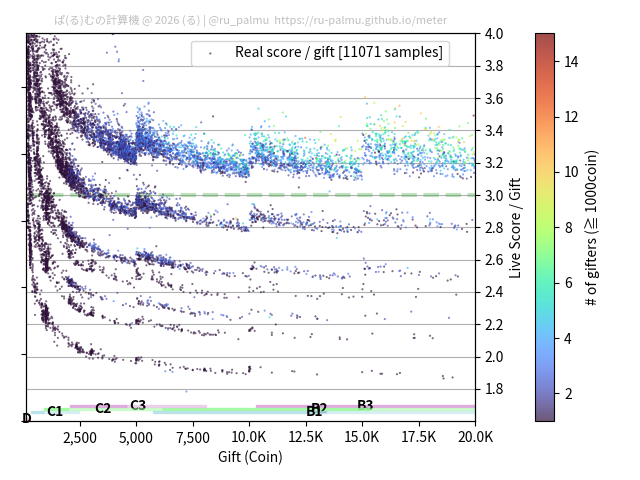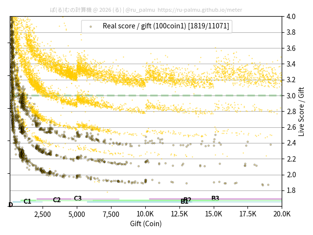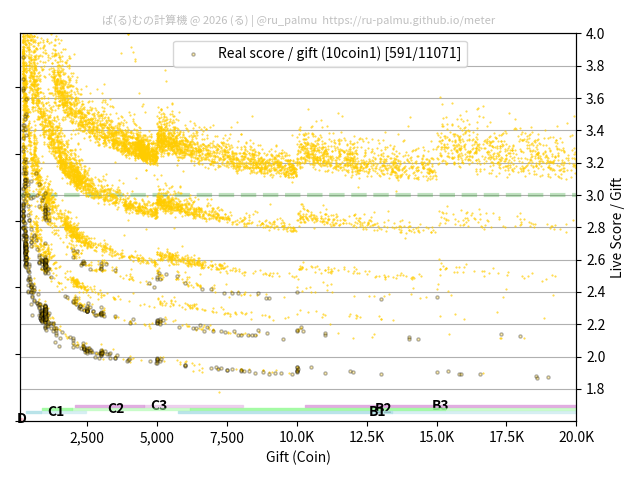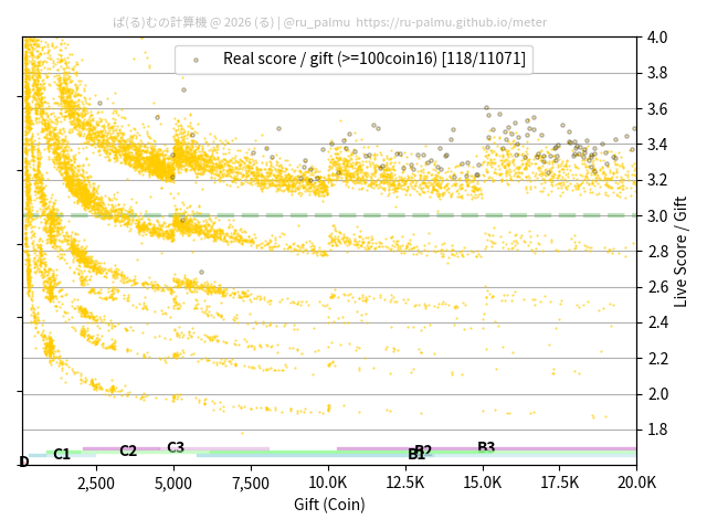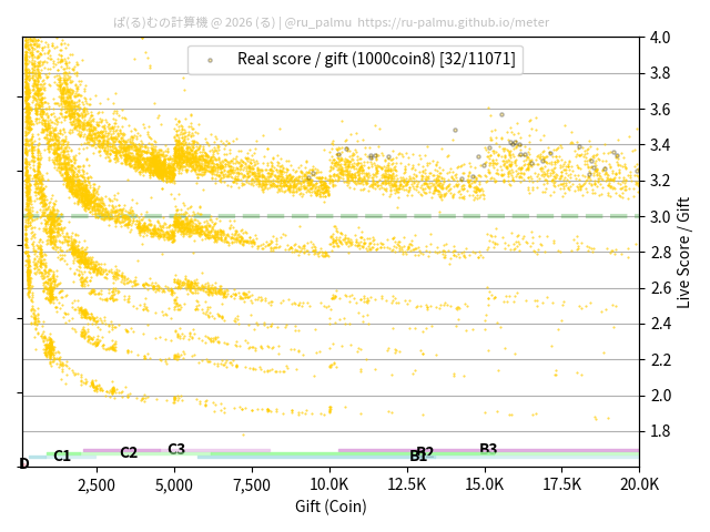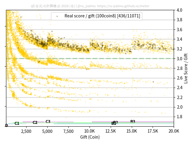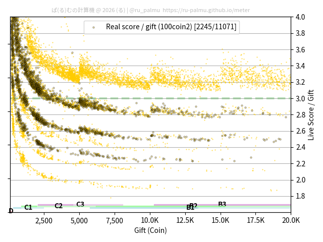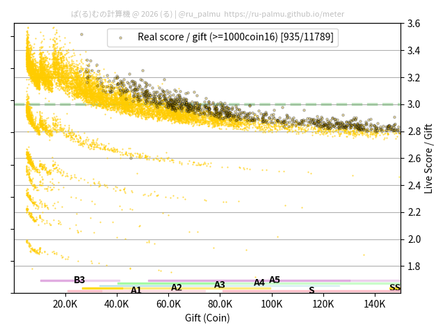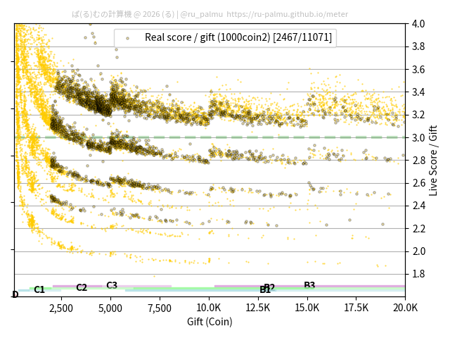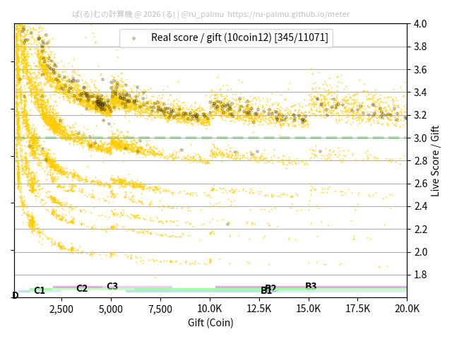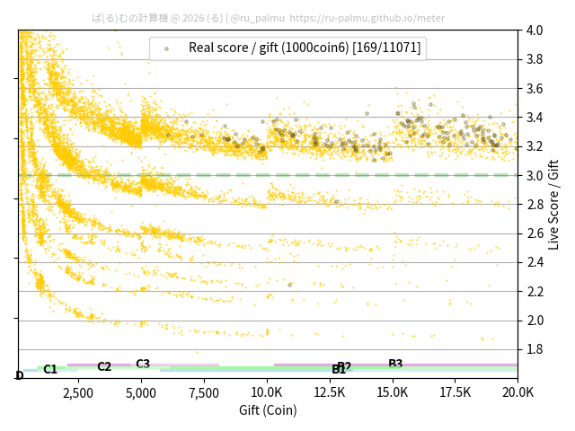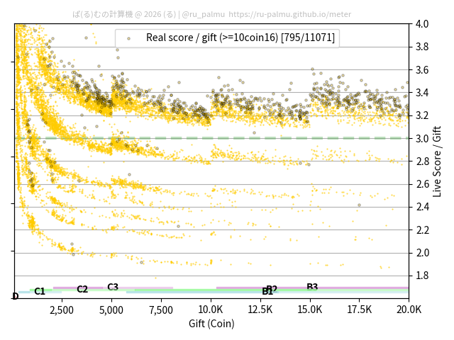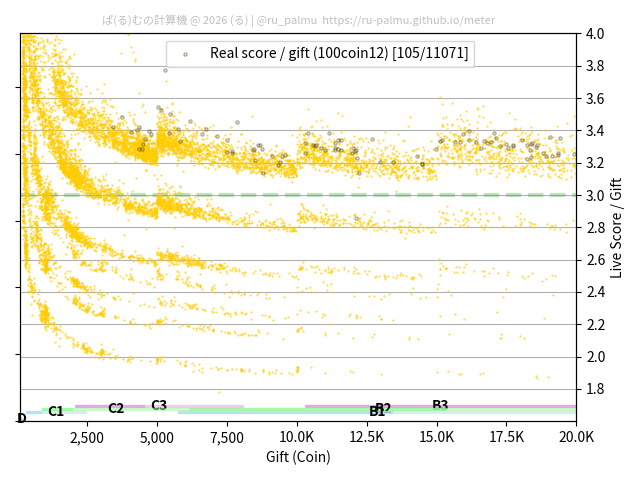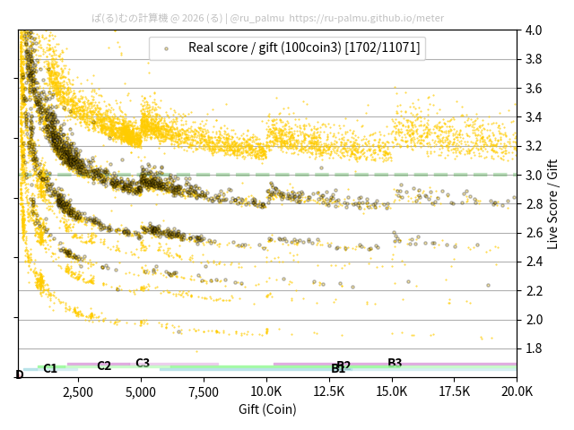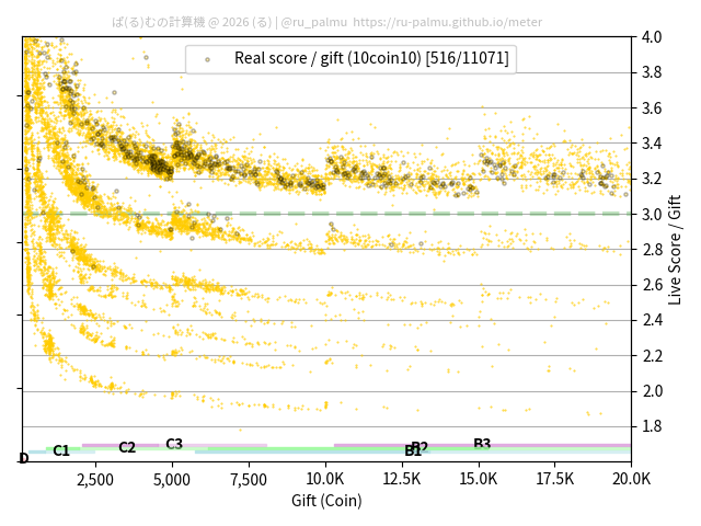 上の散布図は,横軸がコイン数(ギフト数),縦軸がはね率(=ライブスコア÷コイン数)の実測値を表しています. 縦軸の値は 3 になると信じられていたものです.