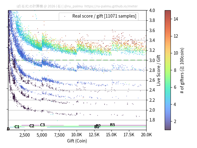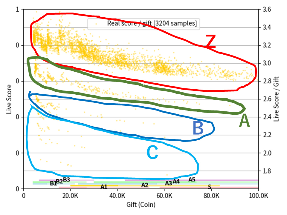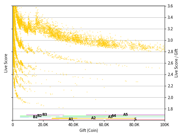 - この図は,コイン数(コイン人数)とライブスコアの関係のみを表していて,ライブスコアを構成する他の要素である,視聴時間やコメント数・スーパーライク数,および,それらの人数は含まれていません. そのため,コイン以外の要素で詰まっている点があるので,全体の 1%以下のような点は無視していいと考えています.